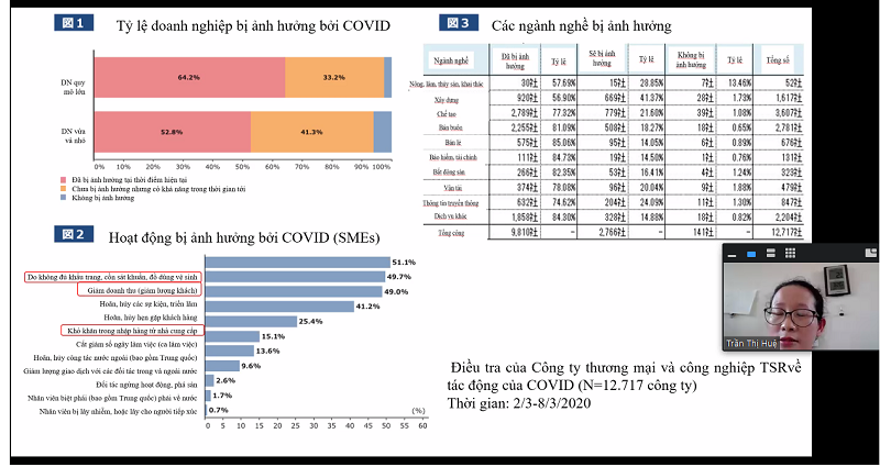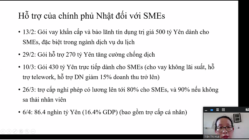 Bà Trần Thị Huệ, Nghiên cứu viên Đại học Kyorin (Nhật Bản), cho biết đại dịch COVID-19 cũng đã gây thiệt hại rất lớn tới nền kinh tế Nhật Bản nhất là đối với doanh nghiệp vừa và nhỏ (SME). Hiện số lượng doanh nghiệp SME chiếm 99,7% tổng số doanh nghiệp, đóng góp tới 53% giá trị gia tăng và giải quyết cho 70% việc làm của nền kinh tế. Theo khảo sát của Bộ Khoa học và Công nghệ Nhật bản với hơn 12.700 doanh nghiệp Nhật, có 65% doanh nghiệp quy mô lớn và 53% doanh nghiệp quy mô nhỏ được hỏi đã trả lời là đã bị ảnh hưởng bởi cuộc khủng hoảng do COVID-19.